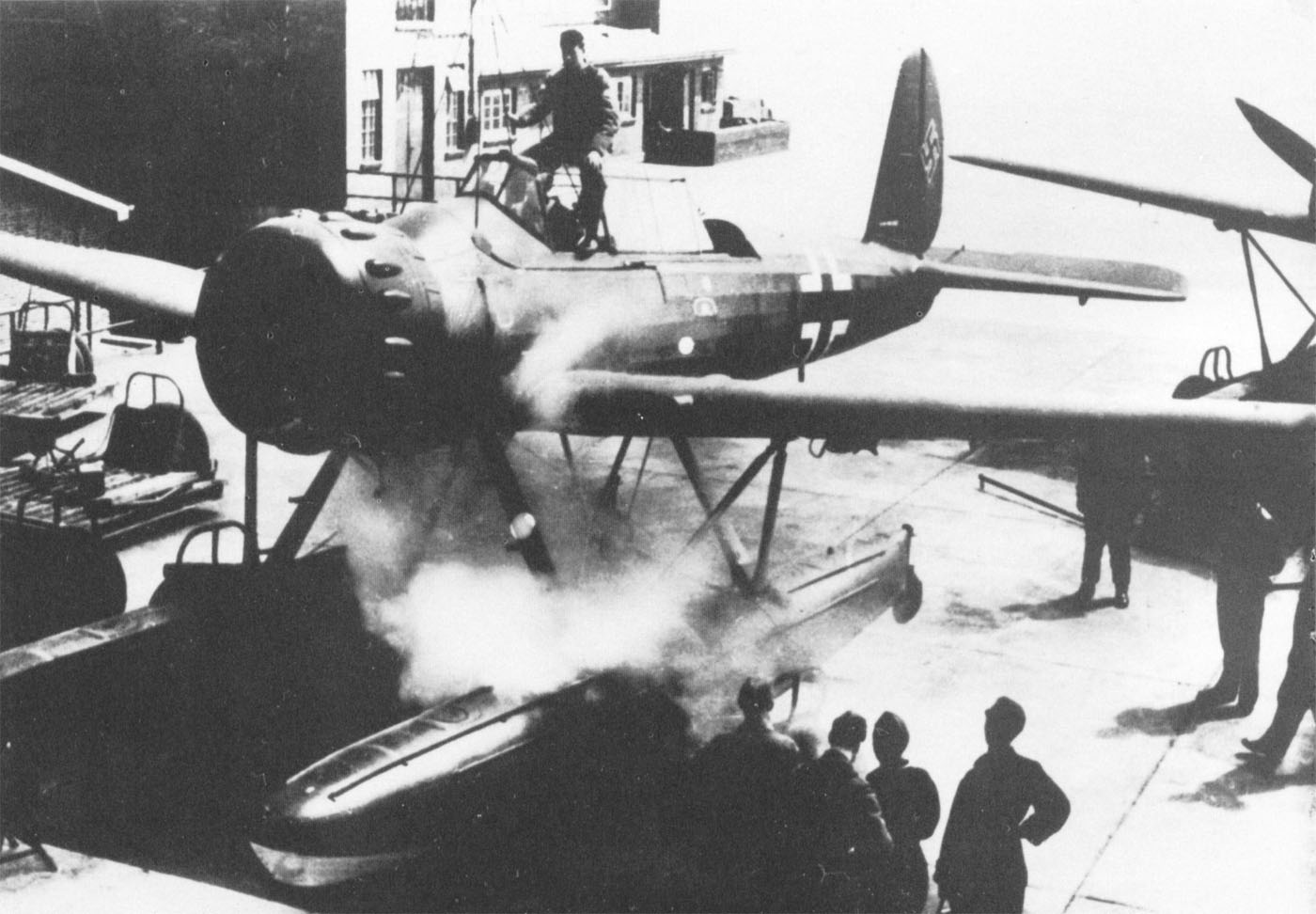 Ar196A2-1.BordFlGr196-(CU+AI)-vkz-(T3+FH)-WrkN100047-Running-Engine-In-Hanger-After-Repair-&-vkz-Change-From-(T3+GH)-Aalborg-Denmark-1941-45af.jpg (178K)