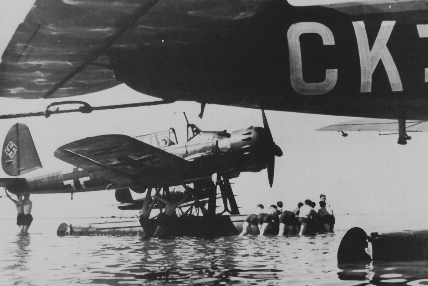 Ar196A 5./Bord.Fl.Gr.196 vkz (6W+.N) Crew Maneuvering Aircraft at Seaplane Base