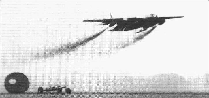 Jumo-004A-0 Engines & with Skid Undercarriage Taking Off Using Walter Ri202b (109-500) RATO Rockets: Note Skid Trailer Being Slowed By Parachute