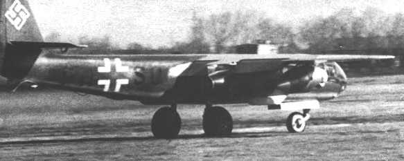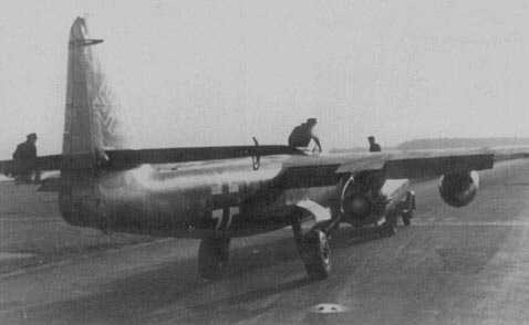 Ar234B-2 V9 (PH+SQ) WNr.130009 with 1st Retractable Tricycle Gear & with Two Jumo-004B-1 Engines Taxiing For Takeoff with Walter Ri202b (109-500) RATOs On Outer Wings Aircraft Used for Bomb Drop Trials 1st Flight March 12, 1944