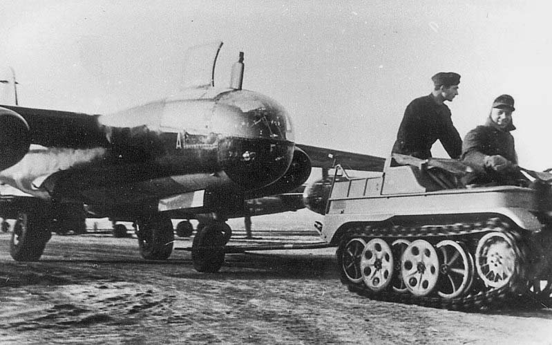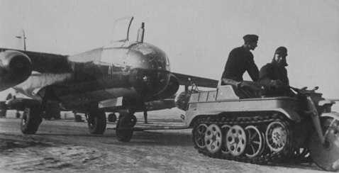 Ar234B2-Stab-III.KG76-vkz-(F1+AD)-BlueA-&-BlueA-Under-Cockpit-&-Blue-Engine-Front-Rings-III-Gruppe-Commander-Major-Hans-Georg-Batcher's-Plane-Towed-By-Sonderkraftfahrzeug-2-[Sd.Kfz.2]-Kettenkrad-to-Dispersal-71f.jpg (13K)