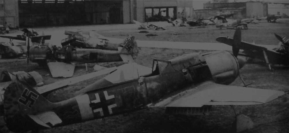 FW190A-8 IV.14./Unknown-Unit (Blue17+Black~) WNr.170412 Focke-Wulf Built, Cottbus (04.44-04.44) Abandoned At Berlin Tempelhof Airport Repair Center Captured By VVS (Voyenno-Vozdushnye Sily) Russian Air Force April 1945, Note: Two Yak-9s At Upper Right