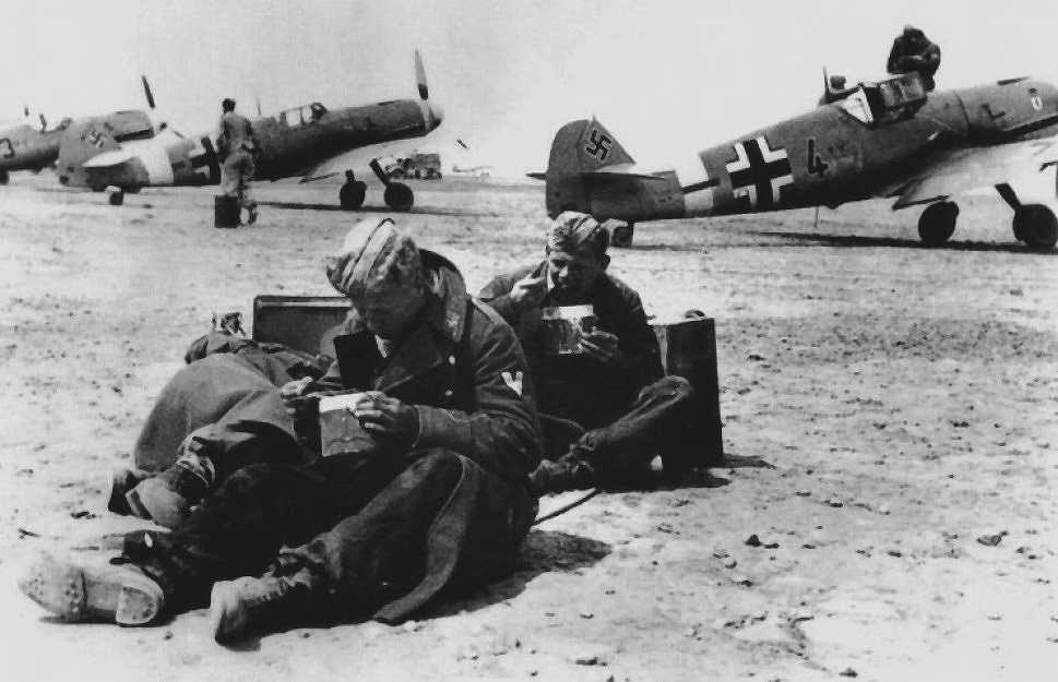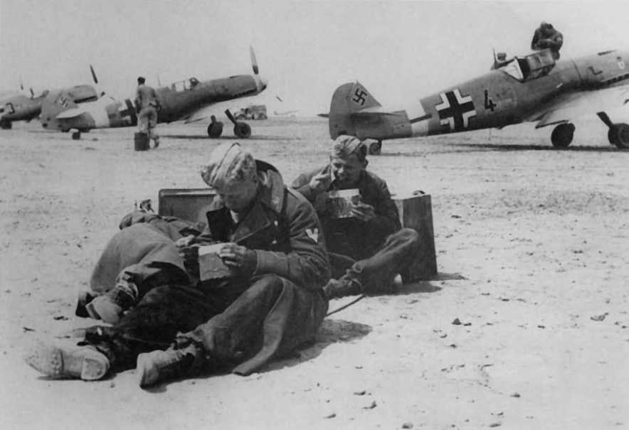 Me109F4Trop-II.5.JG27-Black(4+-)-II-Gruppe-Black-Bear-On-Red-Trimmed-White-Shield-&-Red-Crown-On-Top-(Berlin-Bear)-Emblem-Ground-Crew-Taking-a-Meal-On-the-Line-At-Martuba-Cyrenaica-Libya-North-Africa-February-1942-146less1f-s.jpg (69K)