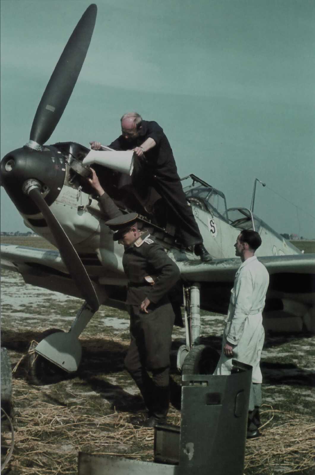 Me109E3-III.7.JG26-White(13+I)-Flown-By-Lt.-Walter-Blume-with-Engine-Cover-Bullet-Hole-&-Mechanic-Filling-Engine-Glycol-Coolant-&-Obfw.-Technical-Service-Officer-Is-Holding-Funnel-At-Caffiers-Airfield-Pas-de-Calais-France-1940_72f-s.jpg (80K)